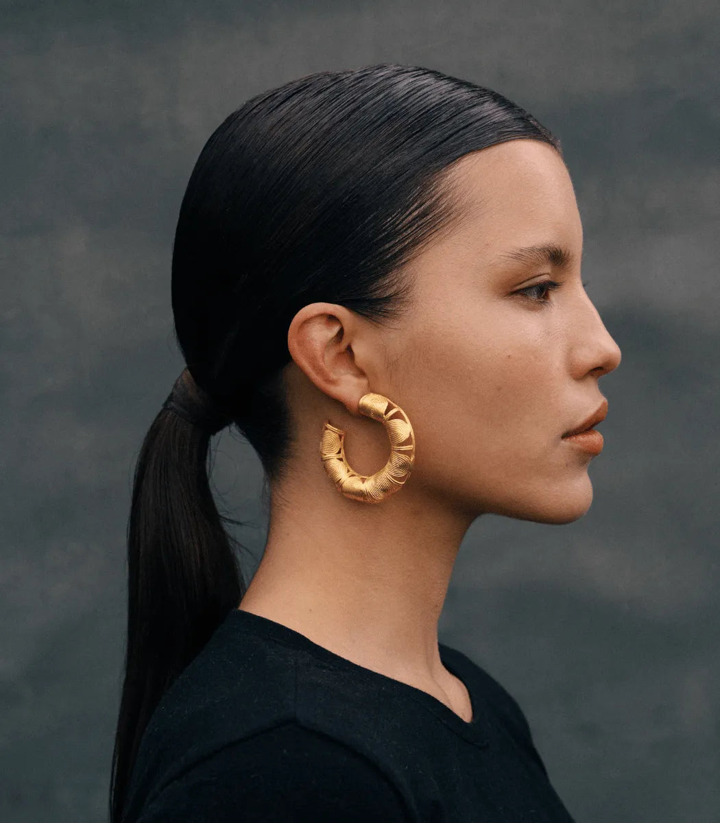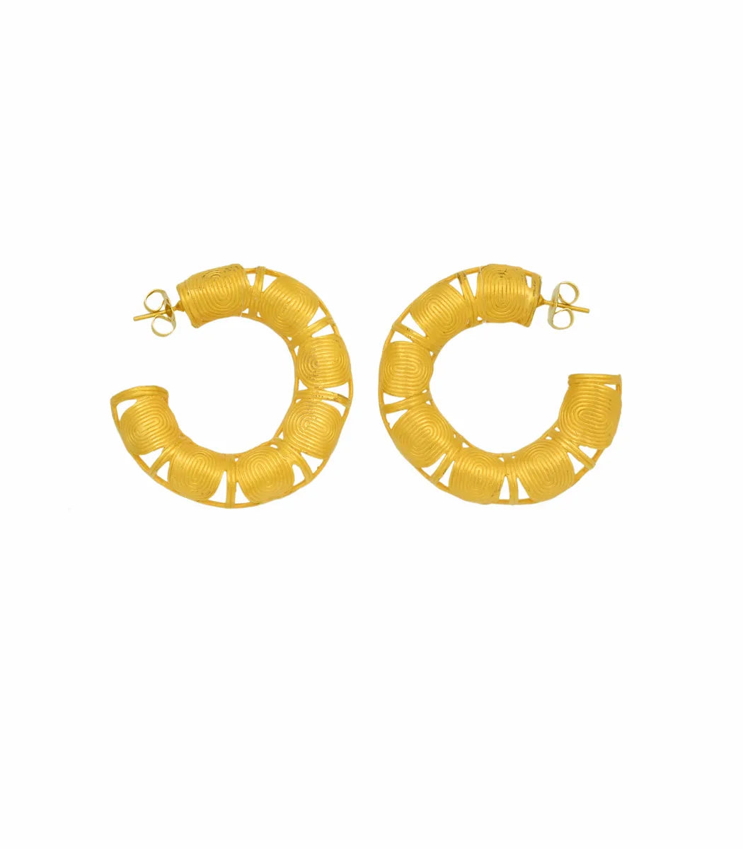 Inspired by the goldsmithing tradition of the ZENU culture, these hoop-style earrings feature an open structure adorned with meticulously crafted spirals and open sections that add visual lightness. A design that blends ancestral forms with timeless character.