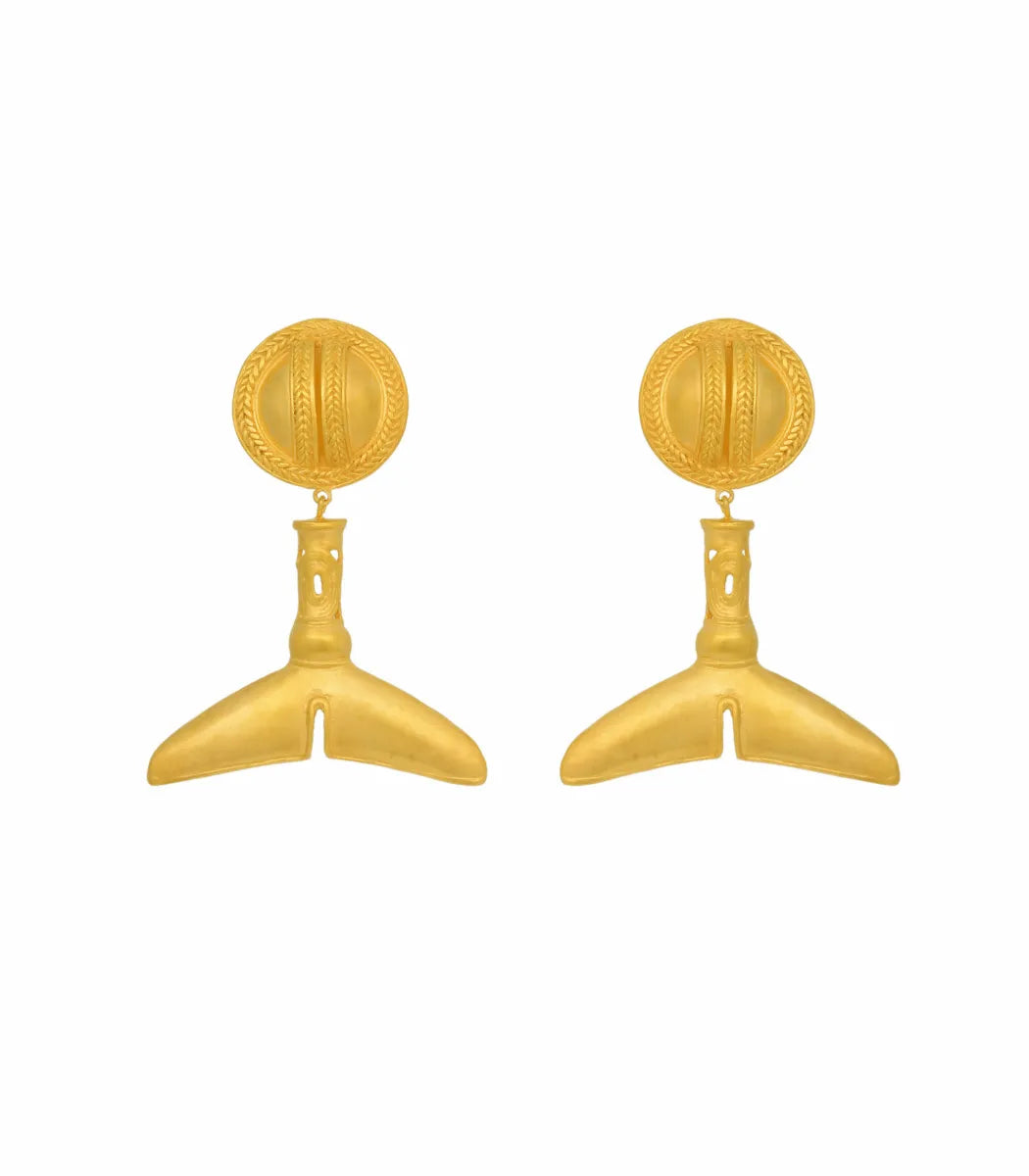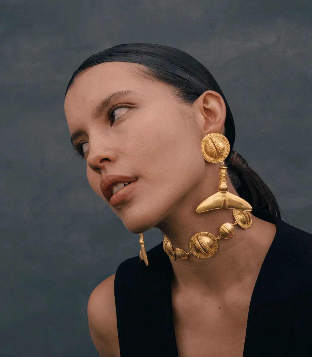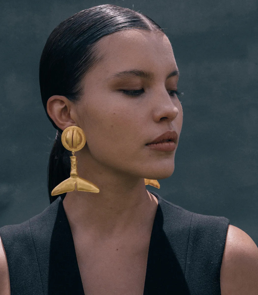Inspired by the goldsmithing of the TAYRONA culture, these drop earrings feature a circular stud with engraved details and a lower piece resembling a fish tail, a recurring symbol in their ancestral art. Their design combines presence and movement, making them a distinctive piece.