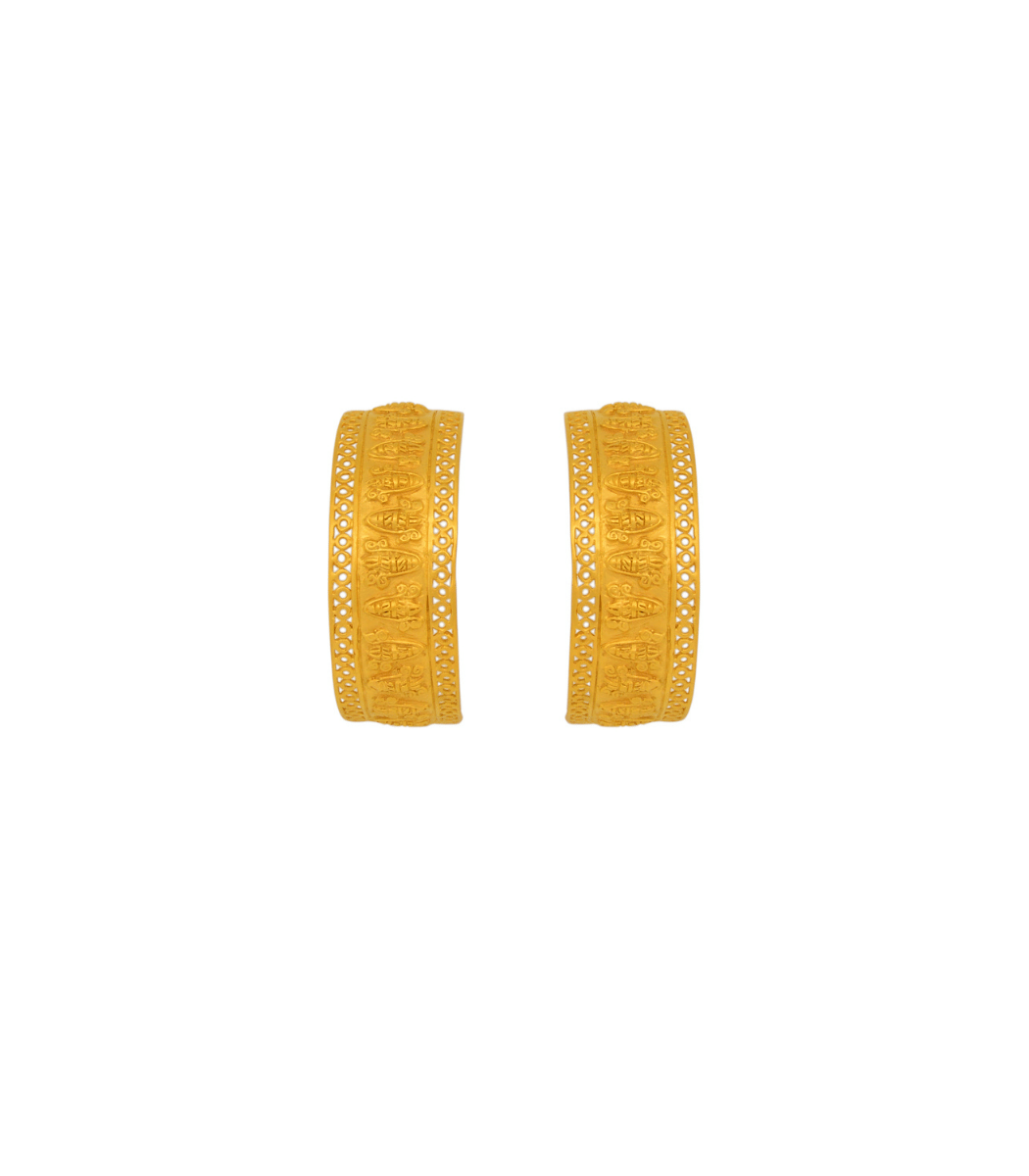 Aros estructurados con texturas que reflejan patrones ancestrales. Su forma envolvente y detalle grabado los convierten en una pieza versátil y llamativa.
