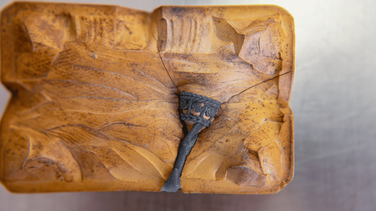 Después de la colada, la pieza de metal enfriada se rompe del molde de yeso y se limpia para ser pulida.