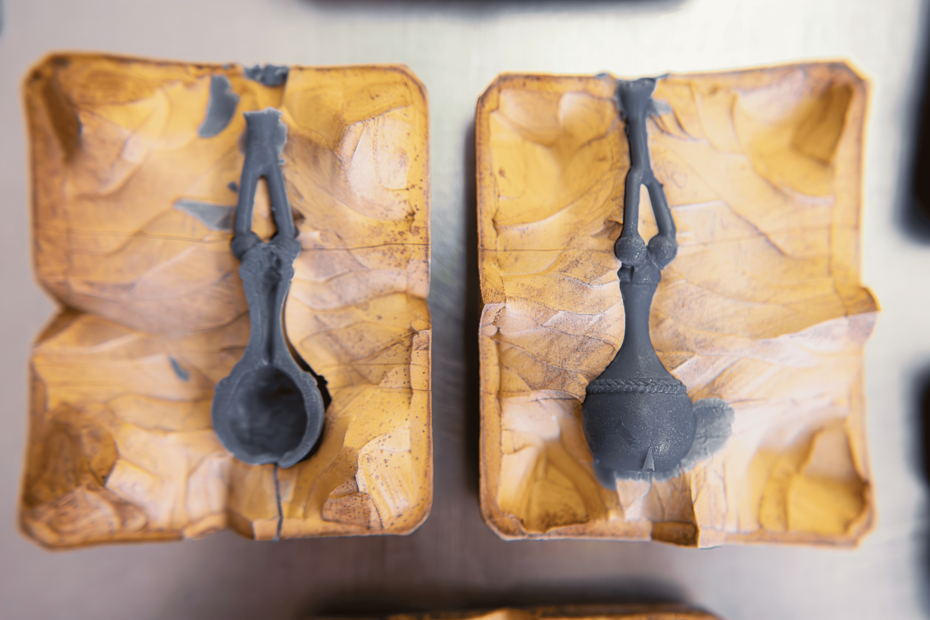 Cada pieza tiene un molde de goma único que está hecho a mano y tomado de las piezas o diseños originales.