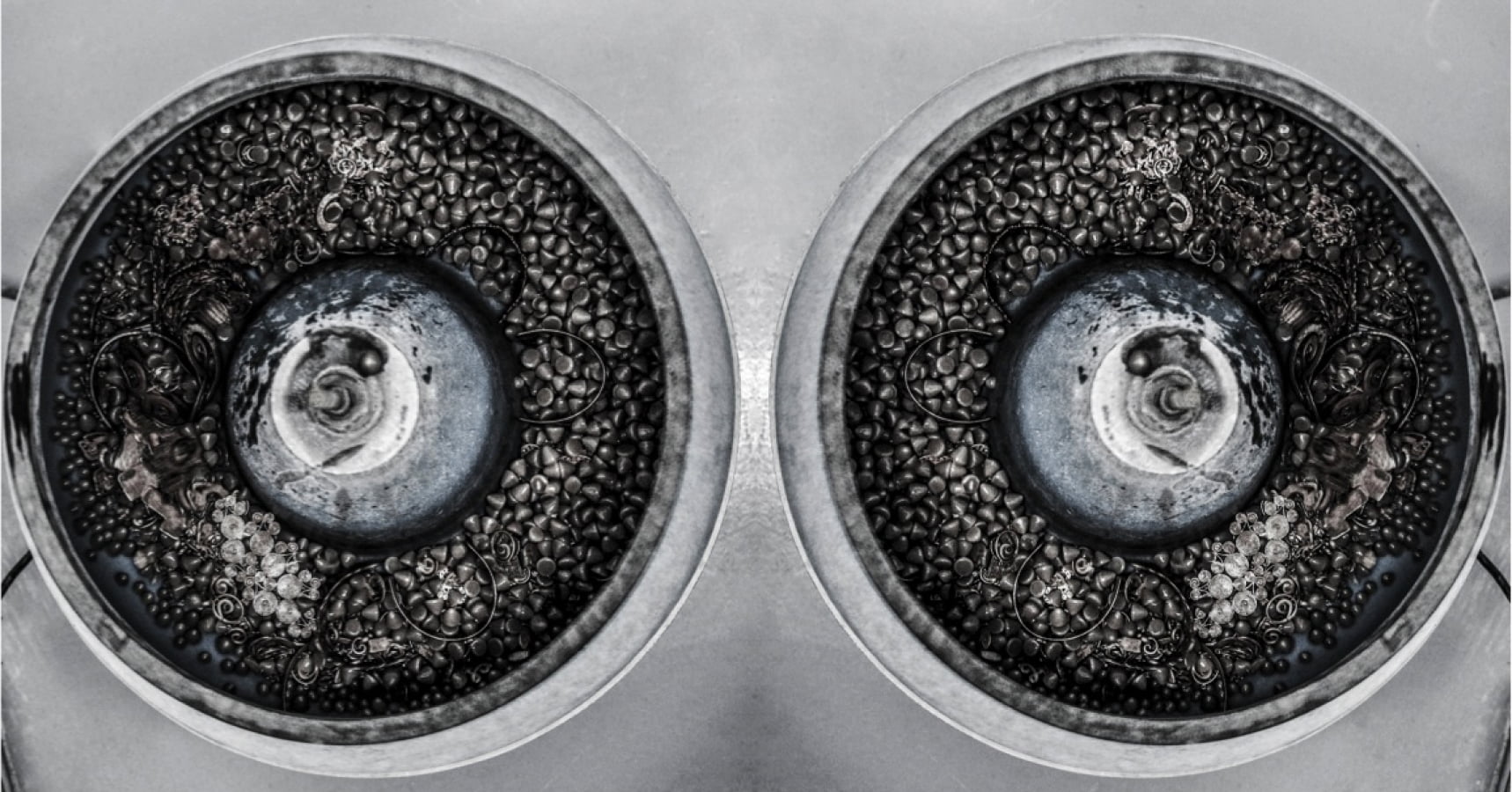 Las piezas se colocan dentro de un vibrador de pulido, un proceso de suavizar su superficie.